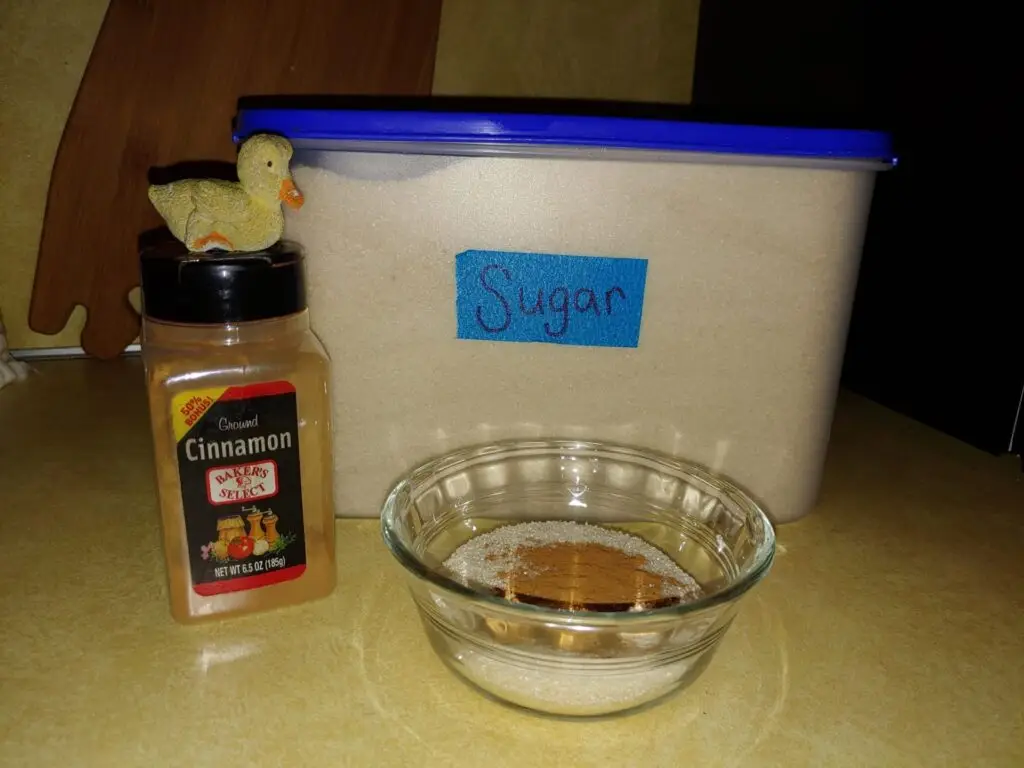 - Mix cinnamon and sugar in a bowl.