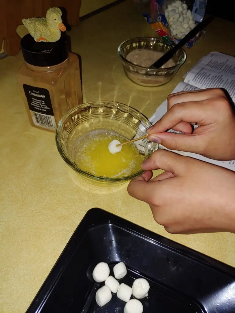 Now, take a single marshmallow and dip it into the melted butter. Then roll the marshmallow in the cinnamon sugar mixture. You can use a toothpick for finger-free dipping.