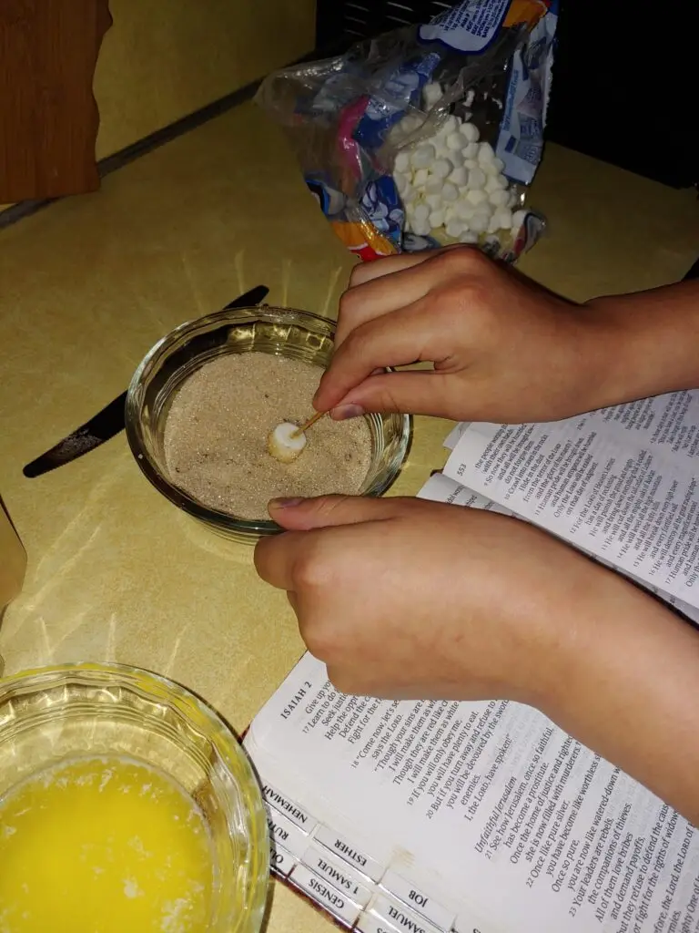- Roll buttered marshmallow in cinnamon sugar mixture.