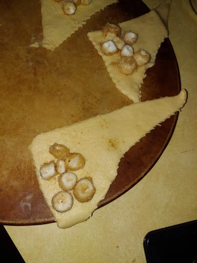Next, you’ll place the marshmallow(s) on the wide end of the crescent roll triangle.
