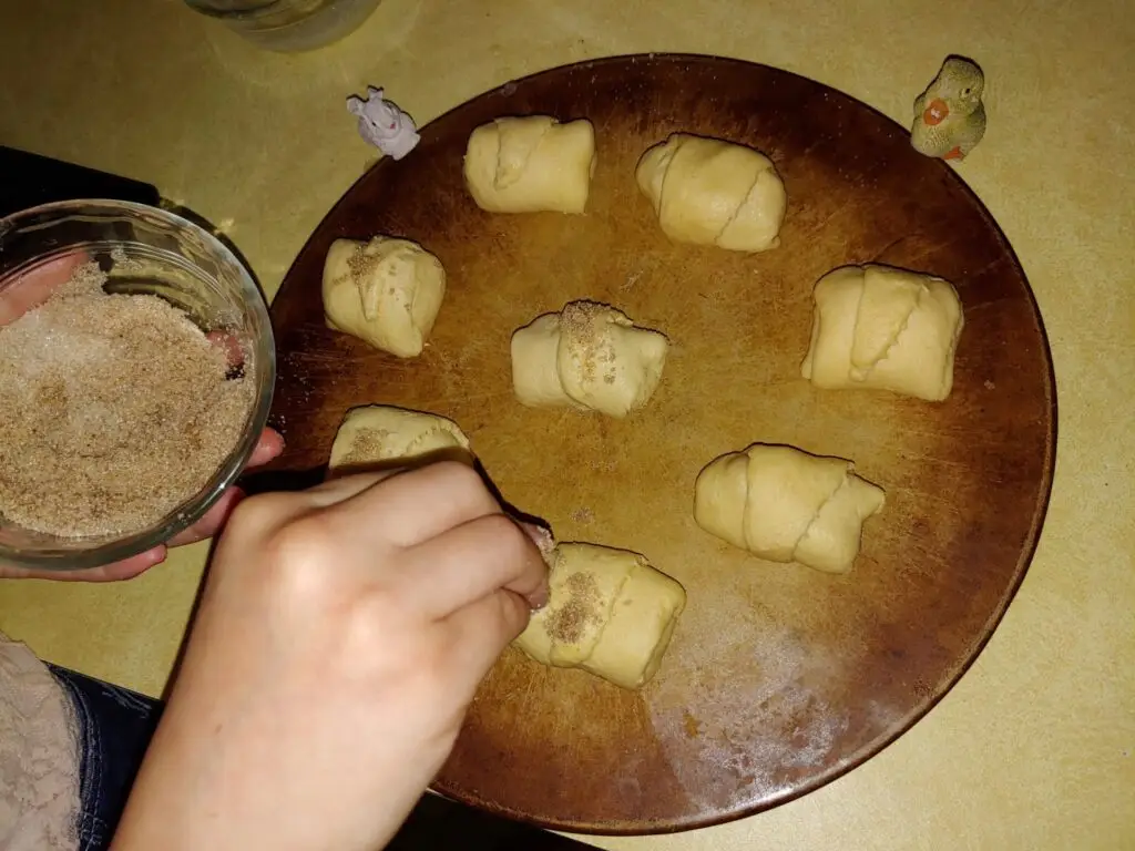 - Brush rolls with leftover butter and sprinkle the tops with cinnamon sugar mixture.